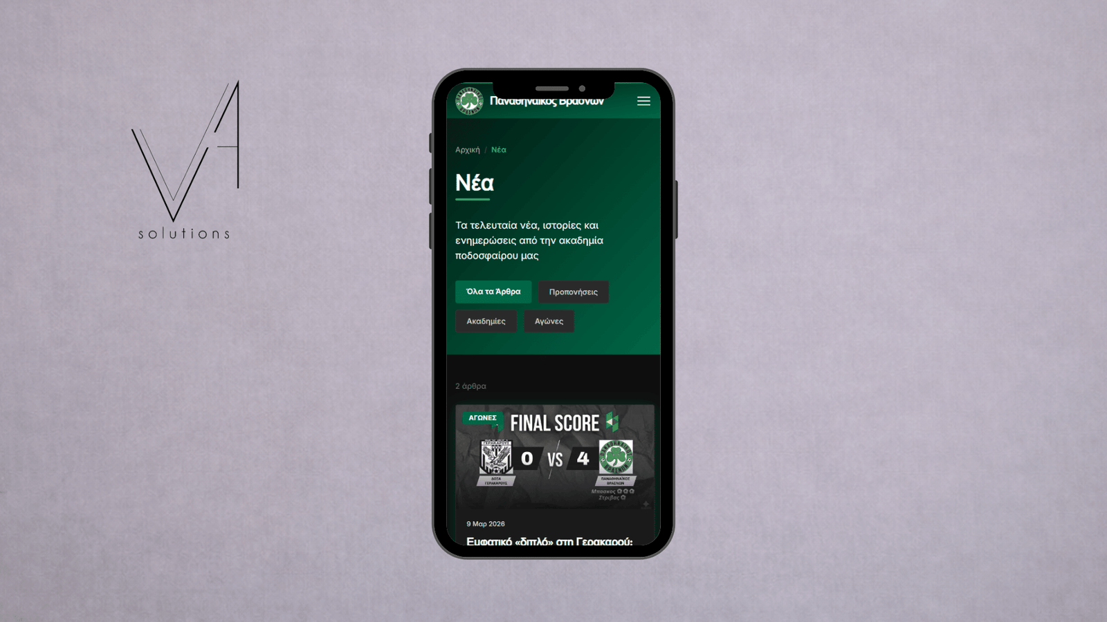 Ανάπτυξη δυναμικής ιστοσελίδας και blog για την ακαδημία ποδοσφαίρου Παναθηναϊκός Βρασνών. Το project υλοποιήθηκε με Headless αρχιτεκτονική (Next.js, Sanity CMS), προσφέροντας μια εξαιρετικά γρήγορη, SEO-friendly και πλήρως responsive εμπειρία χρήστη. Διαθέτει προσαρμοσμένο και εύχρηστο περιβάλλον διαχείρισης περιεχομένου για την άμεση ανανέωση άρθρων, ημερολογίου αγώνων, εκδηλώσεων και φωτογραφικού υλικού της ομάδας, με έμφαση στο performance (Lighthouse 90+).